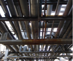 工藝管線上的應用:工藝管線腐蝕嚴重,很多保溫層、管道支架受到破壞。高耐候低表面金屬漆憑借良好的附著力和防護性能。與鐵皮形成牢固的、堅硬密實的保護層,使工藝管道的保溫保冷功能得到有效發揮,保證工藝流程的順利進行。具體見圖14、圖15。